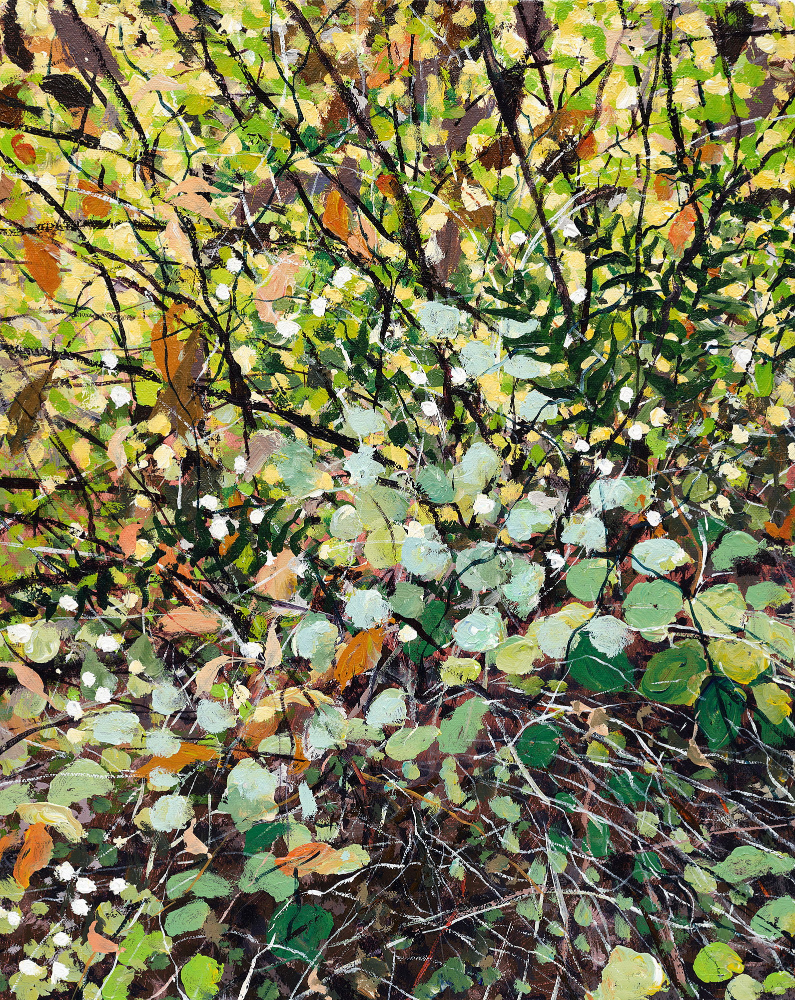 My paintings of the Northwest landscape are informed by my observations of the quality of light found in wild areas of forest lands and reflections on water. The work takes one of two directions. Either it evokes tranquility and patterns found in the vegetation, or it shows the commotion and turbulence I see in jumbled branches and grasses. I'm attracted to both ends of the spectrum, and being reluctant to choose one or the other, follow both paths.