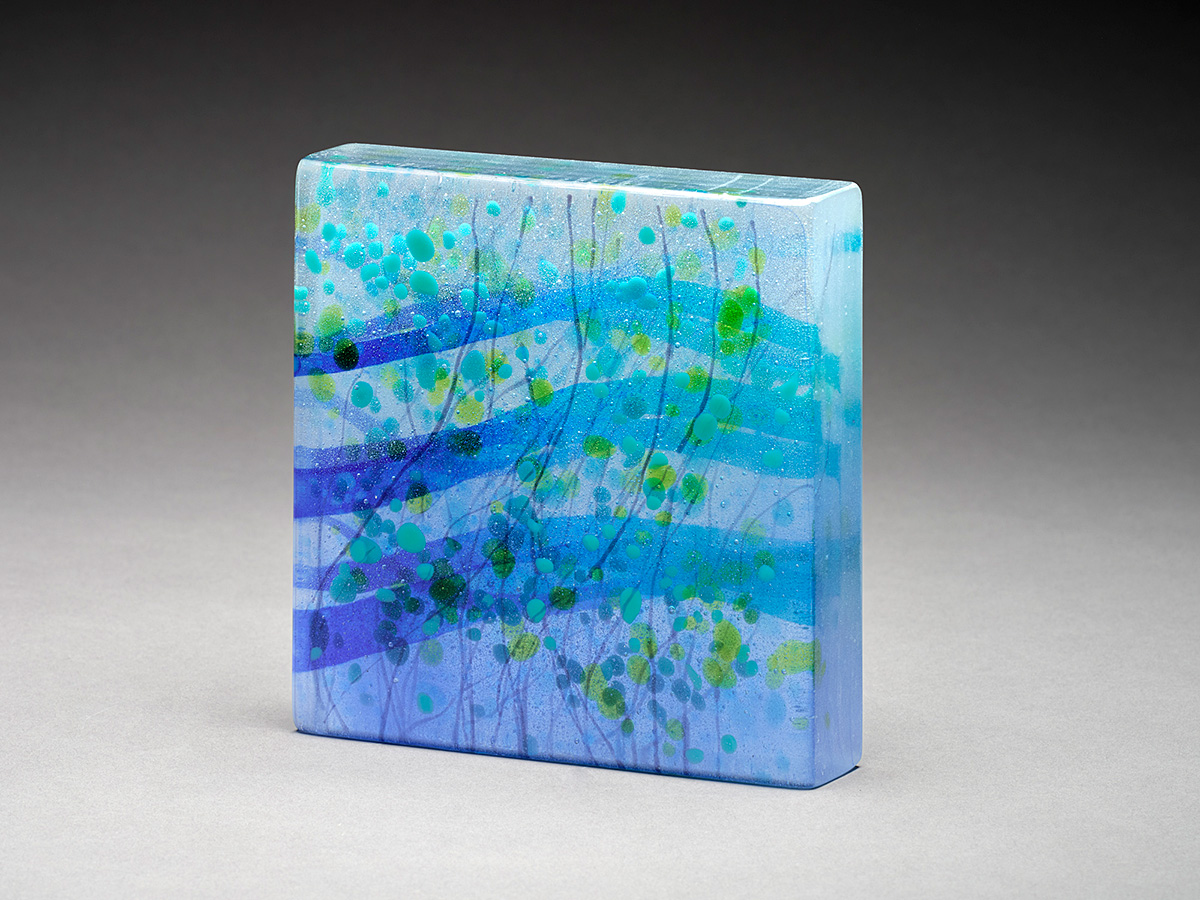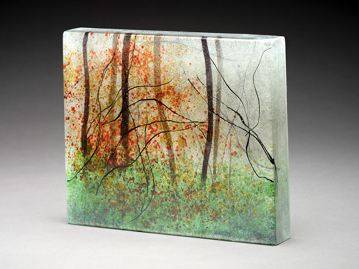 The technique used in this work is a process called “Painting with Light,” developed in 1993 by Narcissus Quagliata in Portland, working with Bullseye Glass Company. He used frits (ground glass), powdered glass and vitrograph (heated and stretched glass rods) to create pictorial work more like his drawings and paintings. Bullseye Glass in sheet form is used for the base of the works for this technique.