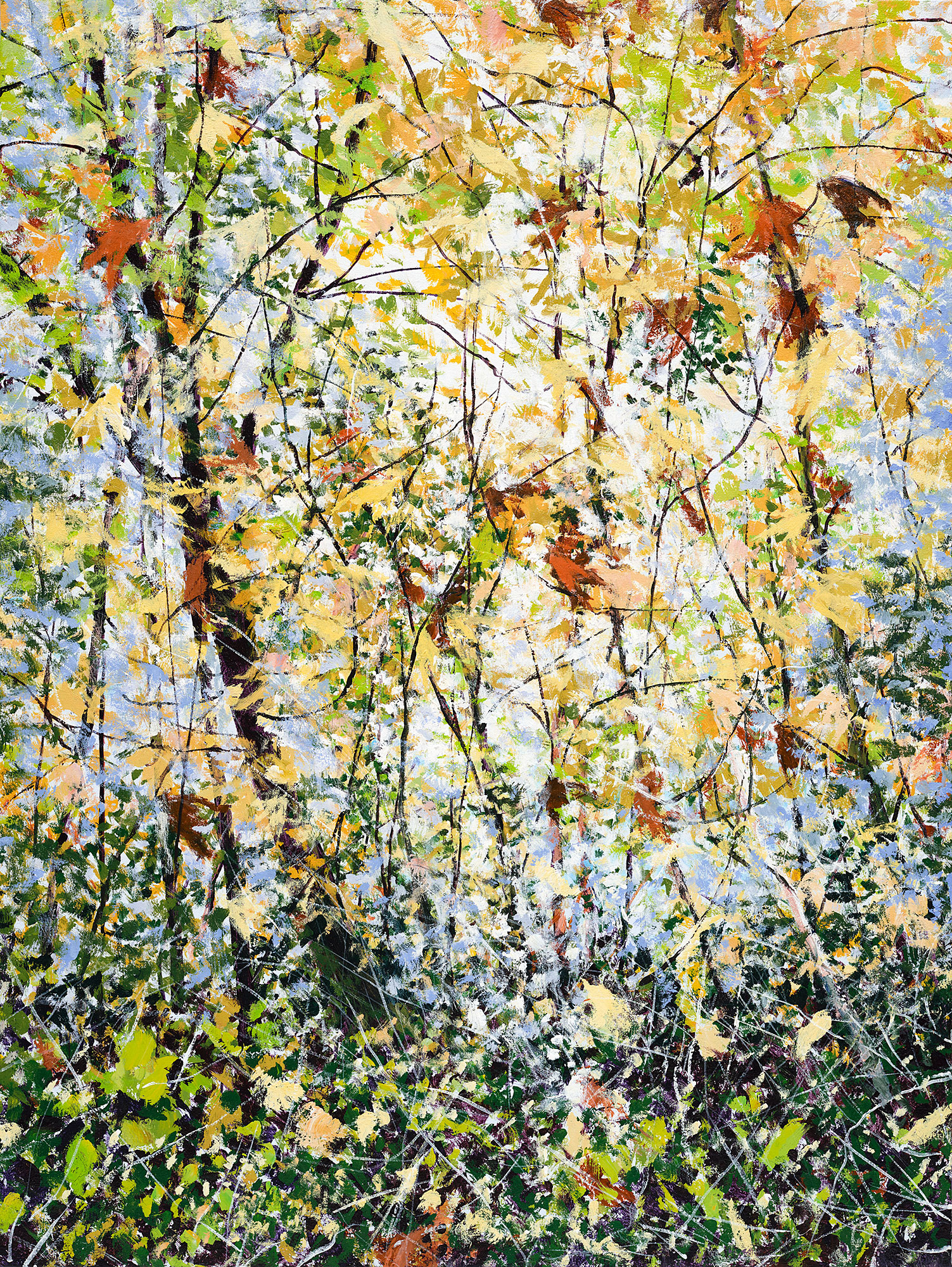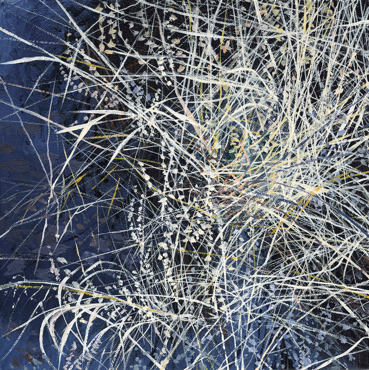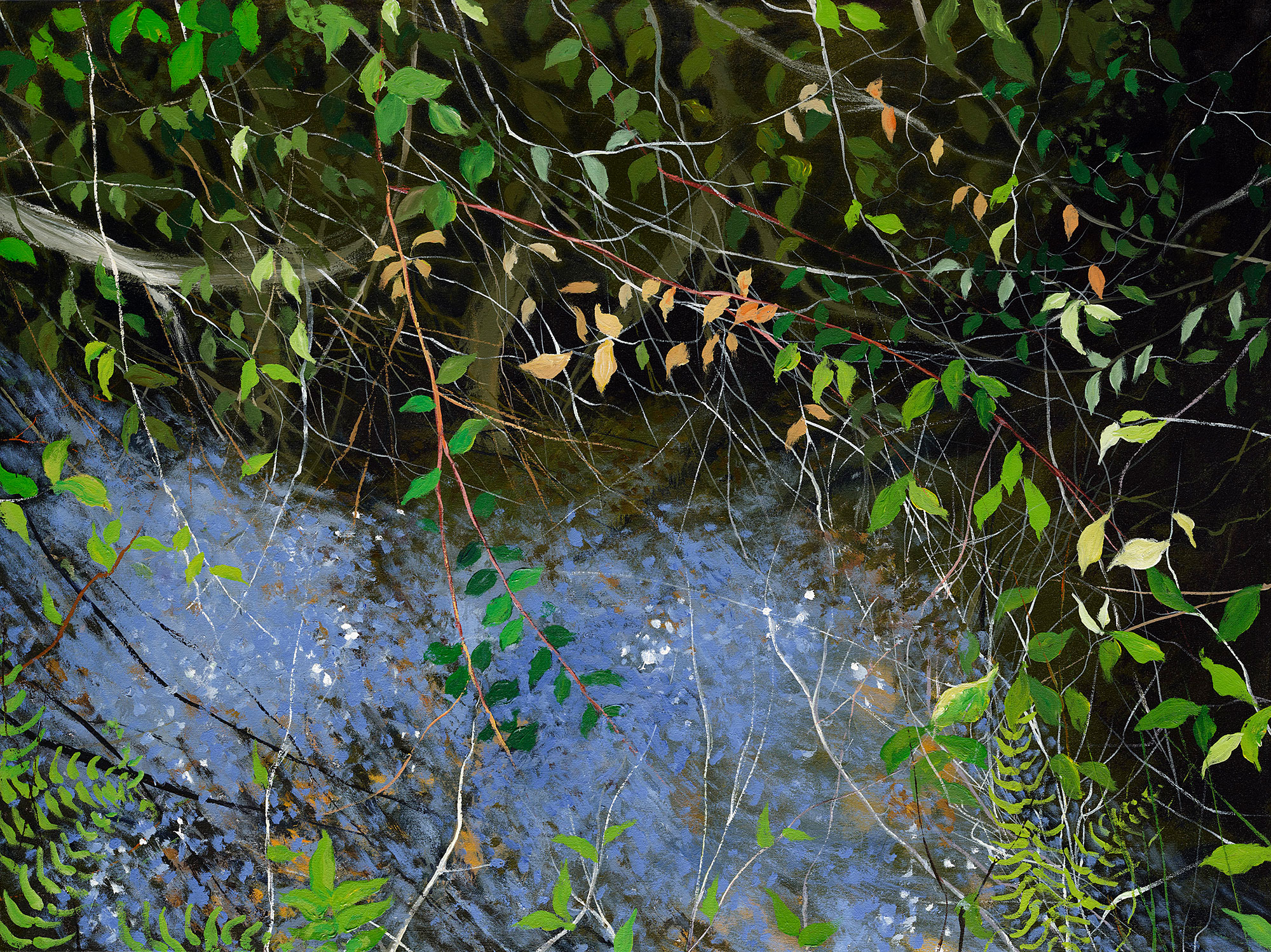 My paintings of the Northwest landscape are informed by my observations of the quality of light found in wild areas of forest lands and reflections on water. The work takes one of two directions. Either it evokes tranquility and patterns found in the vegetation, or it shows the commotion and turbulence I see in jumbled branches and grasses. I'm attracted to both ends of the spectrum, and being reluctant to choose one or the other, follow both paths.