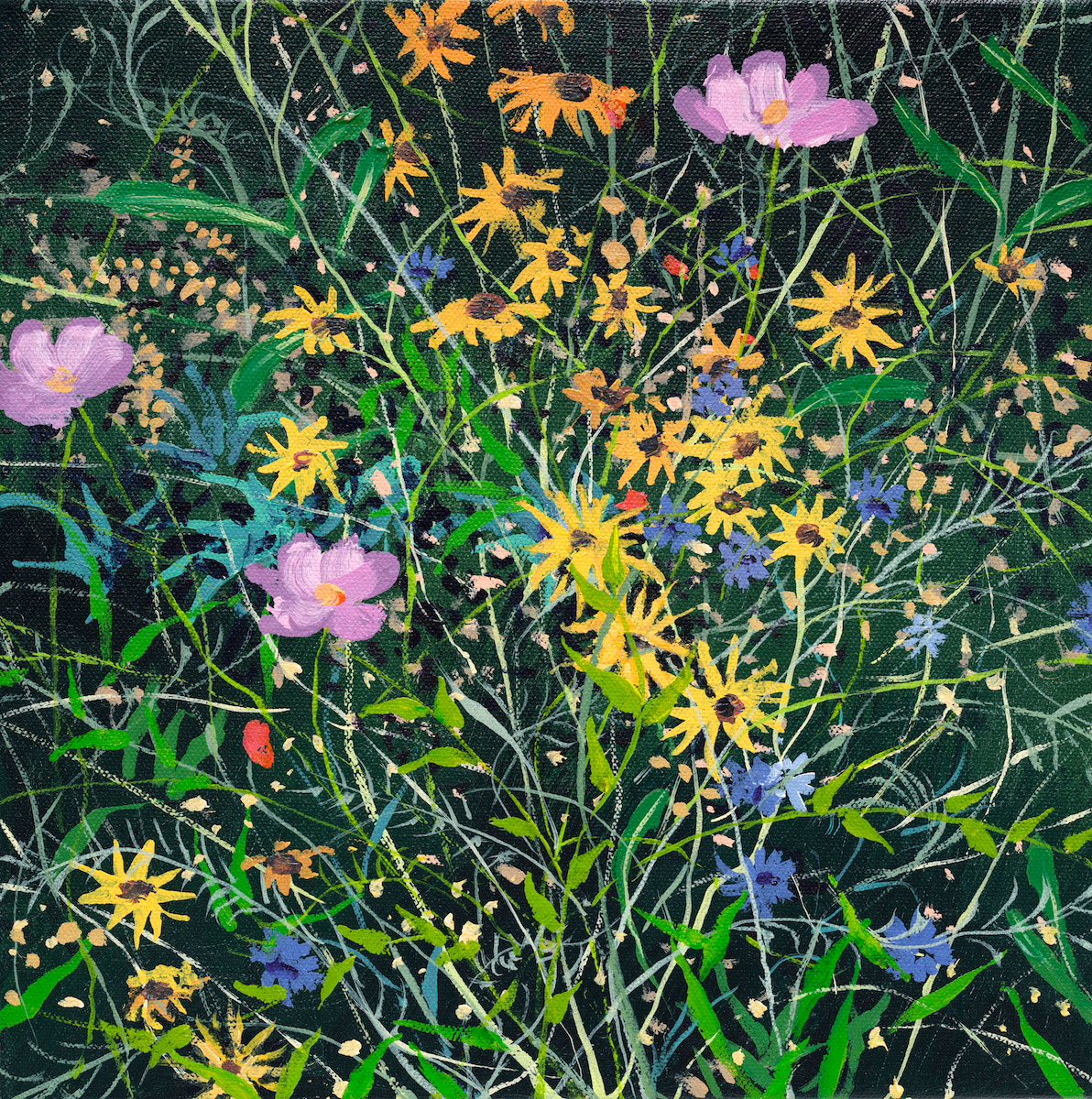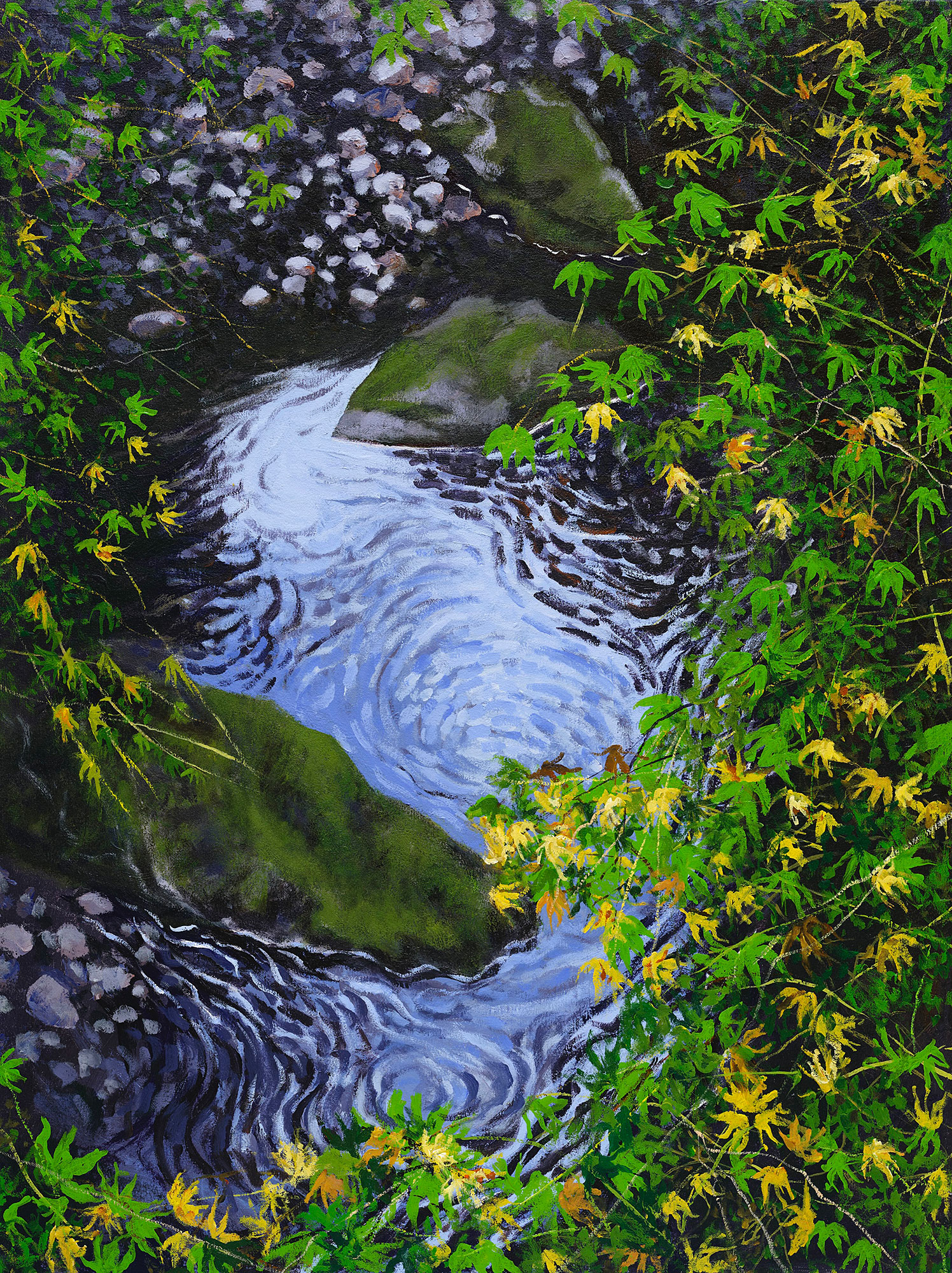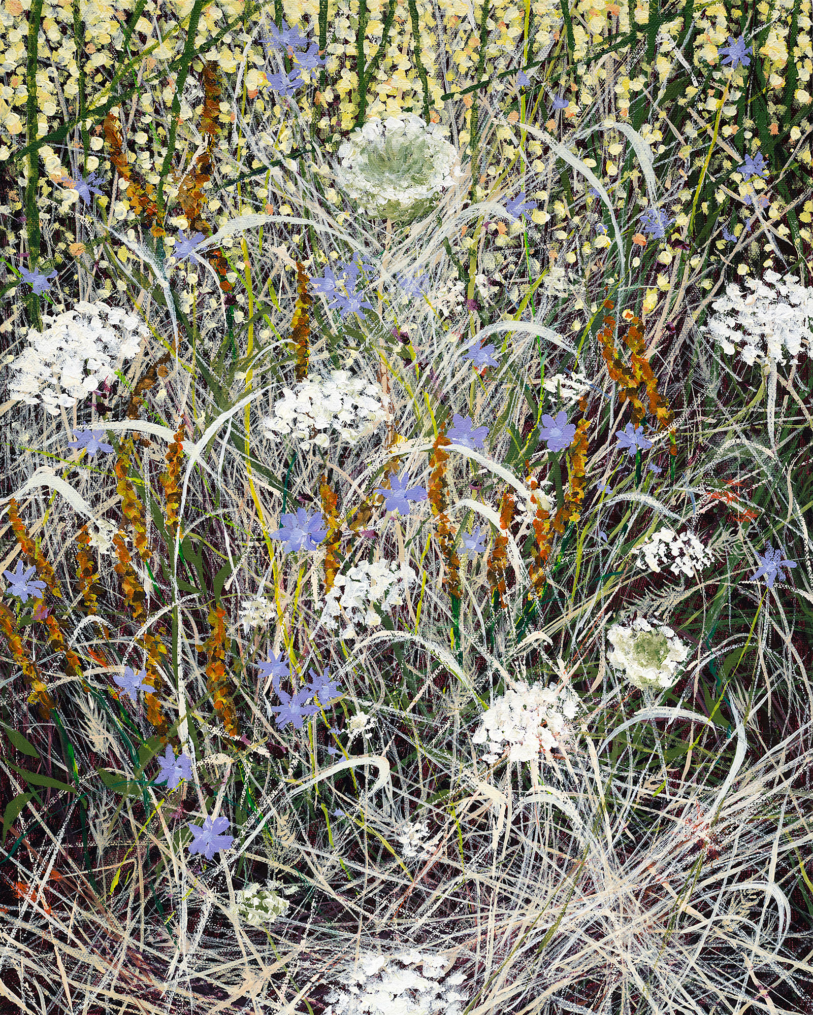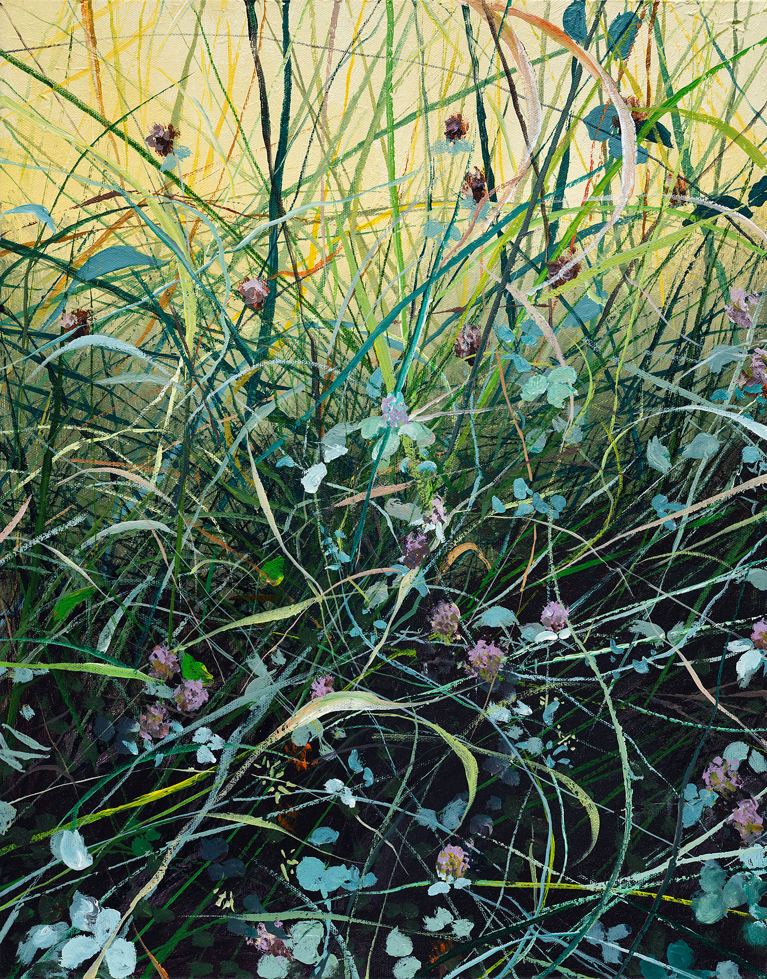My paintings of the Northwest landscape are informed by my observations of the quality of light found in wild areas of forest lands and reflections on water. The work takes one of two directions. Either it evokes tranquility and patterns found in the vegetation, or it shows the commotion and turbulence I see in jumbled branches and grasses. I'm attracted to both ends of the spectrum, and being reluctant to choose one or the other, follow both paths.